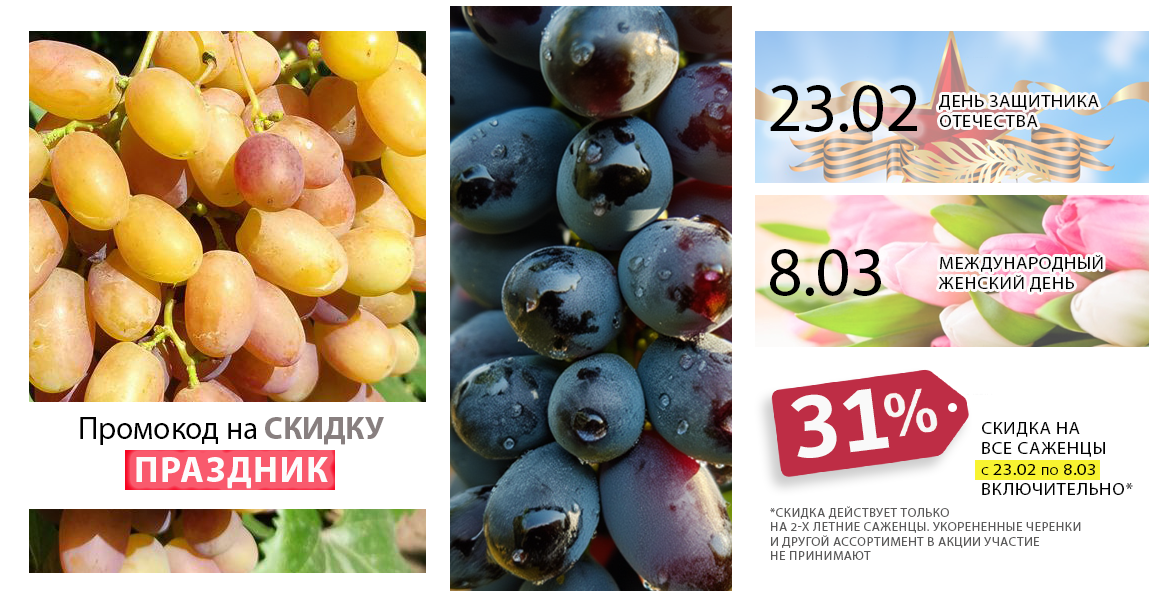Хорошая новость - в честь прекрасных праздников предлагаем скидку 31% на все 2-х летние саженцы из нашего каталога. Скидка действует по 8 марта включительно по промокоду Праздник.